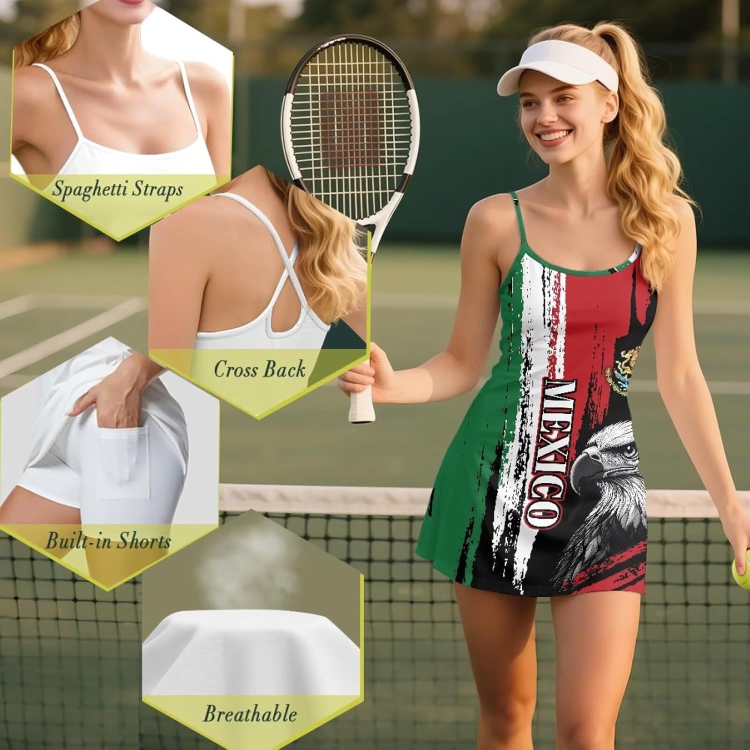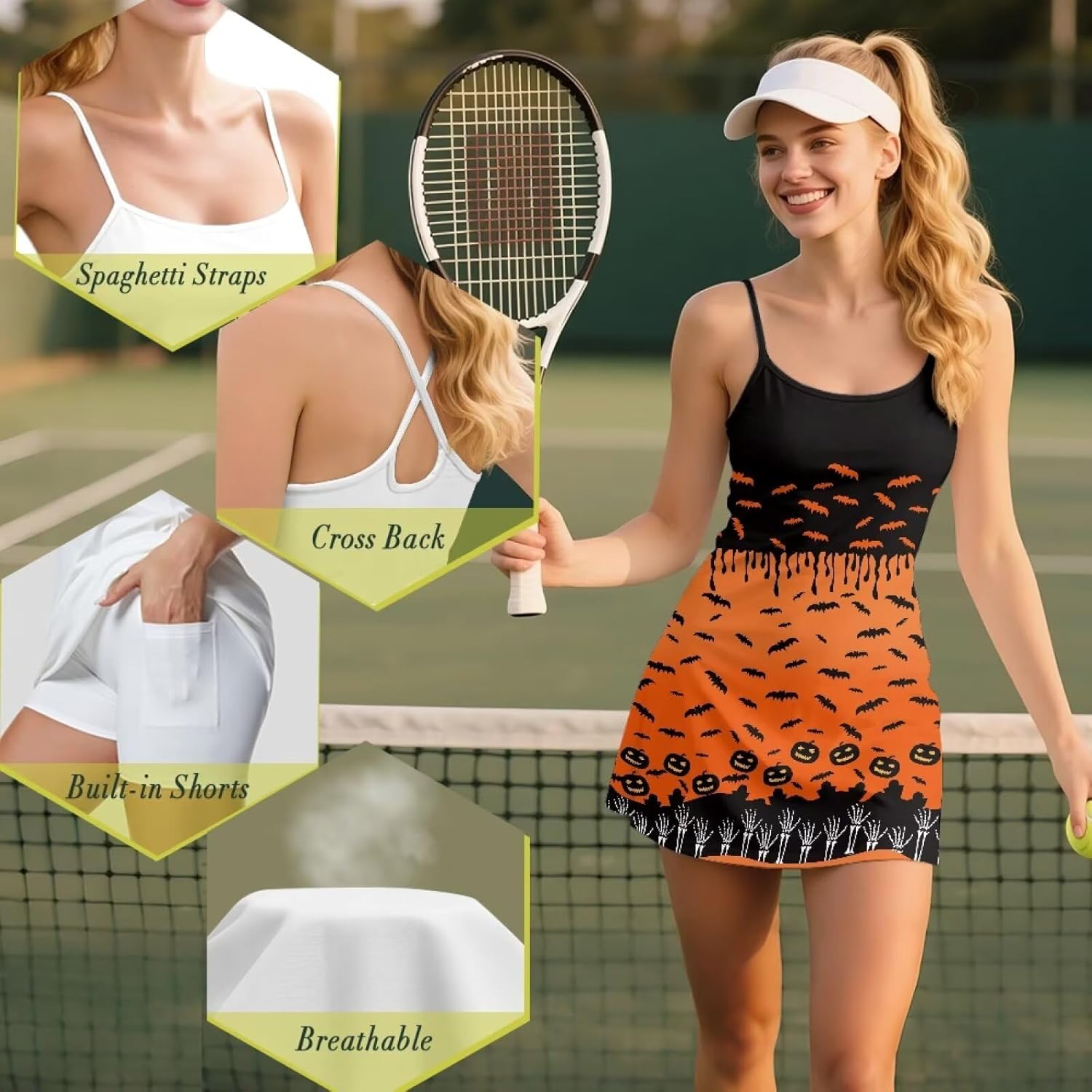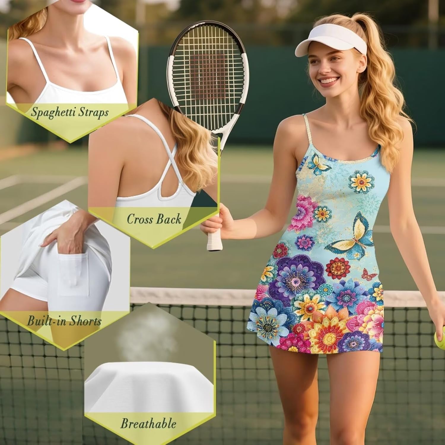 Size To Chose(inch): XS Dress Length: 27.36 Bust:29.92 Waist: 26.57 XS Shorts Length: 12.6 Waist: 22.05 S Dress Length: 27.76 Bust:33.07 Waist: 28.54 S Shorts Length: 12.99 Waist: 25.2 M Dress Length: 28.54 Bust:35.04 Waist: 31.5 M Shorts Length: 13.39 Waist: 27.17 L Dress Length: 29.53 Bust:37.4 Waist: 34.06 L Shorts Length: 13.78 Waist: 29.53 XL Dress Length: 30.31 Bust:39.76 Waist: 37.01 XL Shorts Length: 14.17 Waist: 31.89 2XL Dress Length: 21.3 Bust:42.91 Waist: 39.96 2XL Shorts Length: 14.57 Waist: 35.04 Good Quality Fabric:The tennis dresses for women with shorts is made of excellent polyester and spandex, which is soft, elastic, breathable and close-fitting, bringing you the ultimate comfort experience whether on the court or in the gym A-Line Skirt,confident and charming:This golf skirts is both fashionable and functional, comfortable to wear, with shorts inside, flared, showing a charming A-line shape, while covering the parts that are prone to sweating. Wearing this sports dress, you will have fashionable confidence and easily defeat your opponents Slim Fit:Our womens summer dresses is cut close to the body, providing optimal support and flexibility while highlighting your curves. The fabric's stretch and tailored fit maximize your athletic figure Internal Pockets to meet your every need:Two deep side pockets inside the briefs are handy for storing your phone, keys and cards. From tennis to trail running, this summer dress with pockets lets you keep your essentials close at hand Eye-Catching Look:This athletic dress can be worn with shorts as a casual daily skirt or as a sports jumpsuit/golf outfit for sports. This versatile tennis skirt with shorts will definitely make you the center of attention