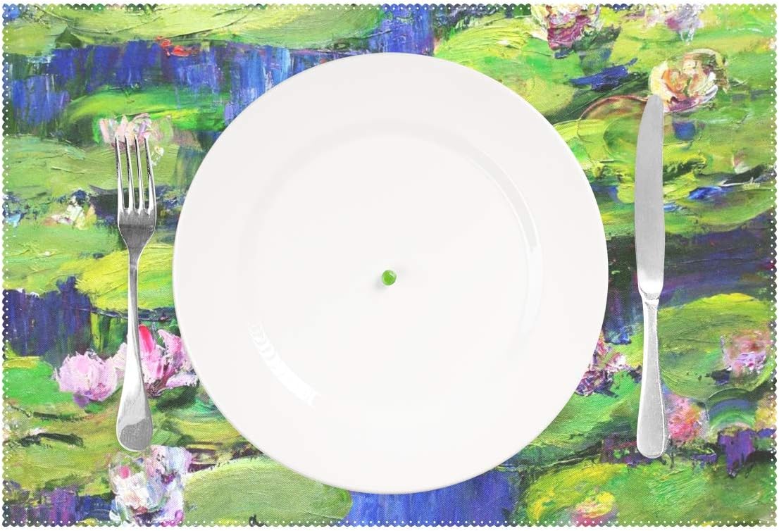 MaterialPolyester,single-sided printing.FeatureDurable,heat-resistant,wipe clean.Elegant dining table mats will make you in happy mood when eating,it will improve your dining experience and impress your guests.ApplicationStylish non-slip insulation placemats would be a good decoration and life quatity for your home,dining hall,kitchen,hotel and business office.Heat-resistant and sound insulation function:avoid the table is burned or cut by tableware.Non-slip and anti-shock:prevent the tableware on the table from slipping at random,and reduce accidents such as falling and breaking.Occassion:Perfect for kitchen/dining room/business office/hotel table use.Also can use in family gatherings,home parties,holiday,festival,business activity etc.