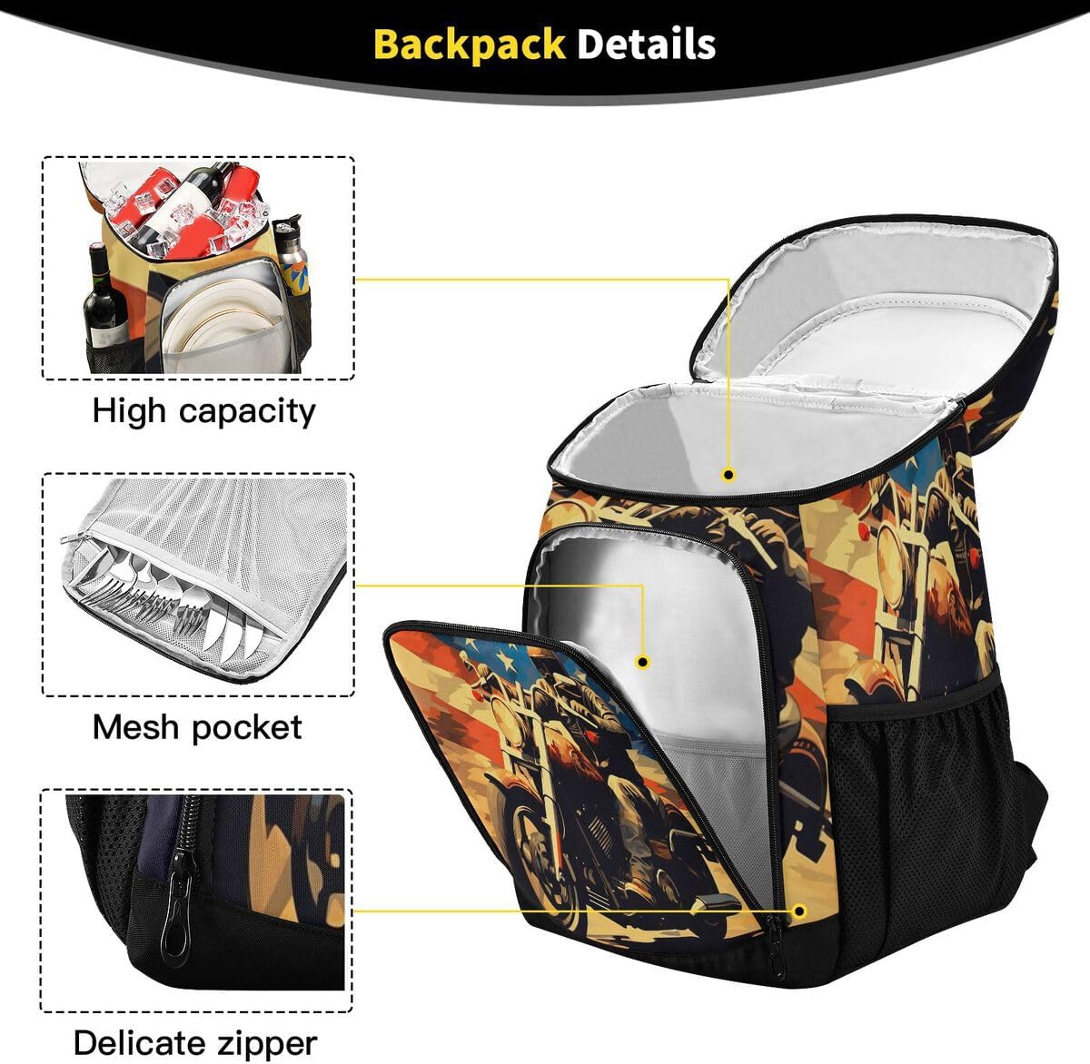 Material: 100% polyester fiber + PEVA (liner) Dimensions: 13 x 7.9 x 16.9 (in) / 33 x 20 x 43 cm Structure: 1 zip insulated main compartment+1 front zip pocket+2 side mesh compartments High quality: 1. High-quality materials: Durable, waterproof, leak-proof, tear-resistant and for maximum durability. 2. High quality zipper: ensure smooth opening. 3. Waterproof material Healthier Living: 1.Freshness preservation: There is a thick thermal insulation wall inside, which can keep food cold/warm/fresh for hours. 2. Say no to fast food: the advanced insulated lunch backpack allows you and your family to start a convenient eating life! You don't have to buy lunch from outside. Lunch Bag Upgrades: 1. The adjustable shoulder straps say goodbye to the traditional way of carrying, ensuring you a more comfortable carrying option. After switching to the backpack, it is easy to free your hands. 2. Spacious and Numerous Pockets: Holds a whole day's worth of meals, food, drinks, snacks, and two side pockets for water bottles, keys, cards and extras. The perfect gift: Lunch packs are great as Christmas gifts, housewarming gifts, couples gifts, wedding gifts. A healthy and romantic lifestyle that can make your life even better!