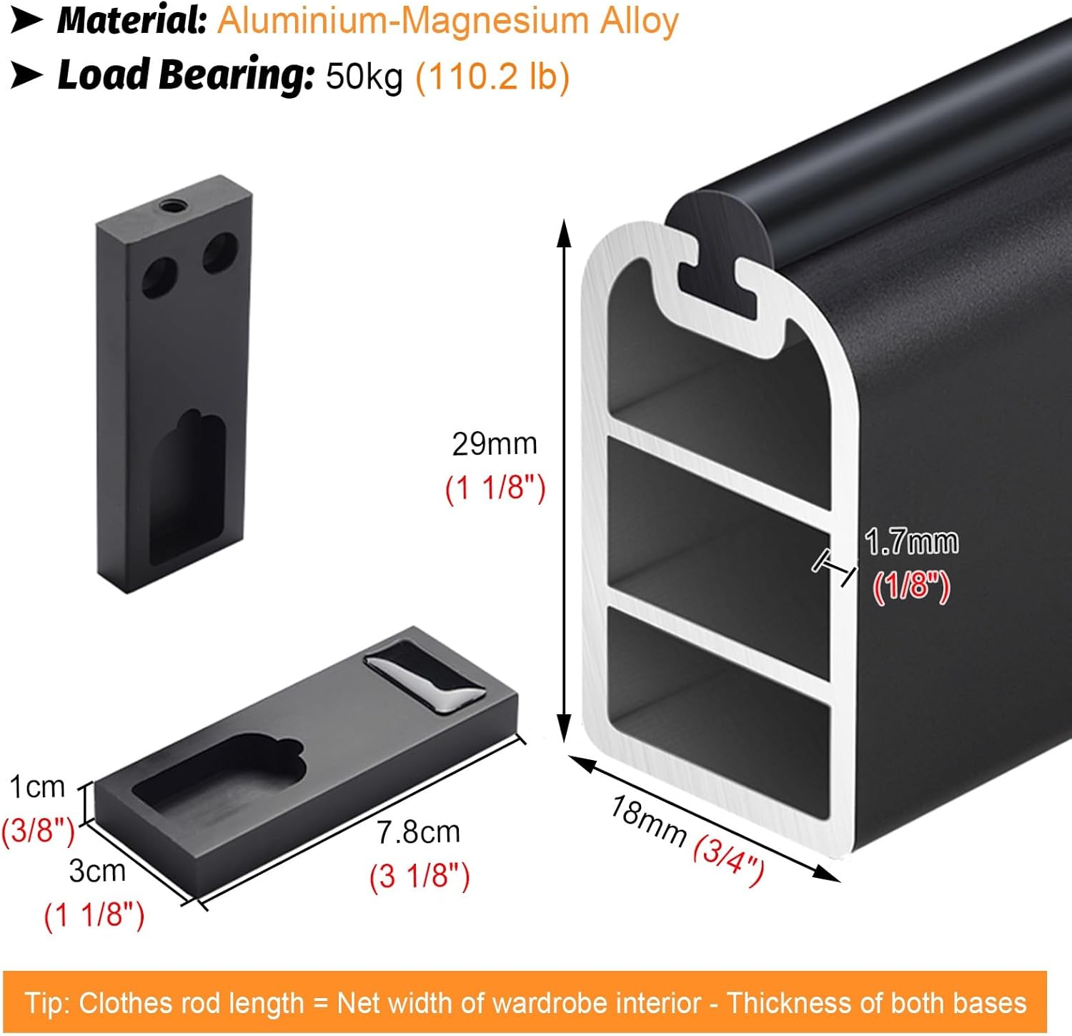 Our wardrobe rod can make full use of the existing space and create more wardrobe space, perfect for placing clothes and organizing your wardrobe. Package Contents:- 1 x Closet Rod- 2 x Flange- 4 x Screw Specification:- Material: Aluminium-Magnesium Alloy- Rod thickness: 1.7mm (1/8")- Load Bearing: 50kg (110.2 lb)- Whether to Assemble: Yes Features:- Sturdy & Strong bearing capacity.- Make the clothes neat and orderly.- Firm fit with the wall, not falling off.- Used in bathrooms to protect privacy.- Will not damage or deform the cabinet.- Used in the kitchen to hang kitchenware.- Can be used for shop display of clothes.- Used in a bedroom or balcony for shade. Kindly Reminder:- Please measure the width of your wardrobe before purchasing.- Due to different displays and different light, there may be some color difference between the picture and the product. Please refer to the actual product.- Due to manual measurement, there may be an error of 1-2 cm. Thank you for your understanding. After-sale policy:- If you have any questions about our clothes hanging rod, please contact us by email, and we will give you the most satisfactory solution.